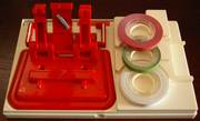 Die Führung des Klebebandes und der Schneidwagen mit zwei Funktionen sind die neuen Konstruktionsideen dieser Klebelehre. Die Lehre ist bei vielen Studiogeräten leicht auf den Kopfträger aufzuschrauben.